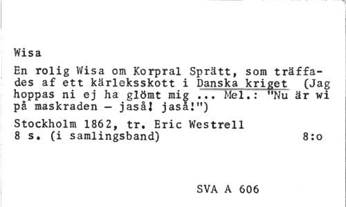 //// Wisa //// En rolig Wisa om Korpral Sprätt, som träffades af ett kärleksskott i Danska kriget (Jag hoppas ni ej ha glömt mig ... Mel.: "Nu är wi på maskraden - jasåj jaså!") //// Stockholm 1862, tr. Eric Westrell 8 s. (i samlingsband) 8:0 //// SVA A 606 ////
