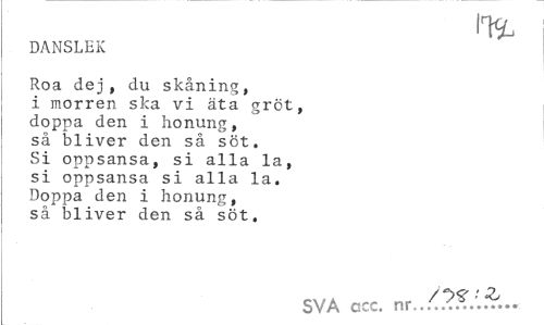 //// DANSLEK //// Roa dej, du skåning, i morren ska vi äta gröt, doppa den i honung, så bliver den så söt. Si oppsansa, si alla la, si oppsansa si alla la. Doppa den i honung, så bliver den så söt, //// SVA occ. ////