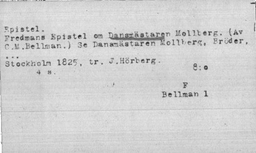 //// Epistel. //// Fredmans Epistel om Dansmästaren Mollterg. (Av //// C .Ni .Be lim an .) Se Dan am ä s tär e rTJfi o 11 > - e r %, Bröder, • * « //// St ockhoLn 1825, tr. J.Hörberg. //// 4 H. 8.0 //// F //// Bellman 1 //// I ////