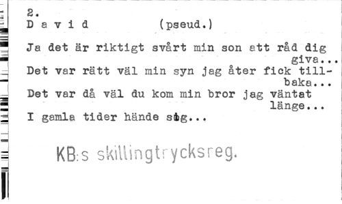 //// : 2. //// y David (pseud.) //// | Ja det är riktigt svårt min son ett råd dig ¦ o giva... //// d Det var rätt väl min syn jag åter fick till-l baka... //// J Det var då väl du kom min bror jag väntat 3 länge... //// | I gamla tider hände sig... //// i KB:S skillingtrycksreg. [ ////