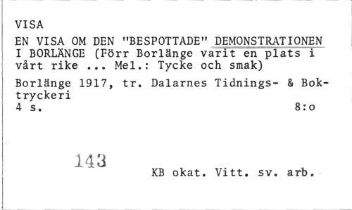 //// VISA //// EN VISA OM DEN "BESPOTTADE" DEMONSTRATIONEN I BORLÄNGE (Förr Borlänge varit en plats i vårt rike ... Mel.: Tycke och smak) //// Borlänge 1917, tr. Dalarnes Tidnings- & Boktryckeri //// 4 s. 8:0 //// 143 //// KB okat. Vitt. sv. arb. ////