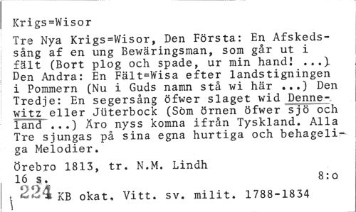 //// Krigs=Wisor //// Tre Nya Krigs=Wisor, Den Första: En Afskeds-sång af en ung Bewäringsman, som går ut i fält (Bort plog och spade, ur min hand! ...), Den Andra: En Fält=Wisa efter landstigningen i Pommern (Nu i Guds namn stå wi här ...) Den Tredje: En segersång öfwer slaget wid Denne-, witz eller Juterbock (Söm örnen öfwer sjö och land .. .) Äro nyss komna ifrån Tyskland. Alla Tre sjungas på sina egna hurtiga och behageliga Melodier. //// Örebro 1813, tr. N.M. Lindh //// 16 s. 8:0 //// t 224 KB okat. Vitt. sv. milit. 1788-1834 ////