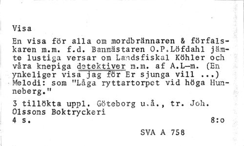 //// Visa //// En visa för alla om mordbrännaren & förfals-karen m.m. f.d. Banmäståren O.PcLÖfdahl jämte lustiga versar om Landsfiskal Köhler och våra knepiga detektiver m.m. af A.L-m. (En ynkeliger visa jag för Er sjunga vill ...) Melodi: som "Låga ryttartorpet vid höga Hunneberg. " //// 3 tillökta uppl. Göteborg u,å., tr. Joh. Olssons Boktryckeri //// 4 s. 8:0 //// SVA A 75 8 ////