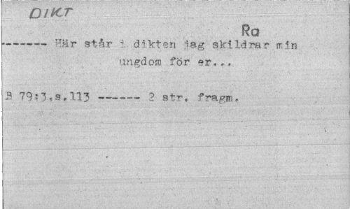 //// DIKT //// R a //// ---Här står i dikten ,iag skildrar min //// ungdom för er. //// 3 79:3,3.113---2 str, fragn. //// ' ... \ ////