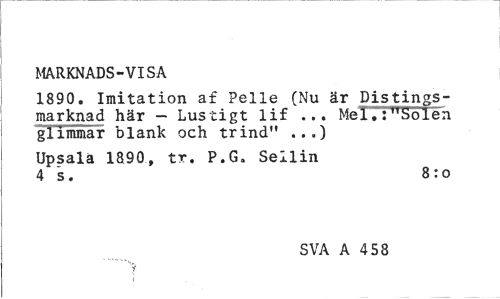 //// MARKNADS-VISA //// 1890. Imitation af Pelle (Nu är Distingsmarknad här — Lustigt lif ... Mel.:"Solen glimmar blank och trind" ...) //// Upsala 1890, tr. P.G» Sellin 4 s. 8:0 //// SVA A 4 58 //// f ////