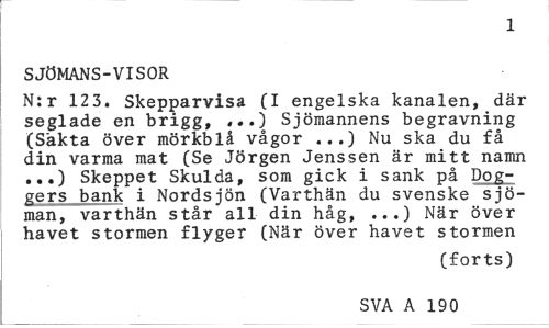 //// 1 //// SJÖMANS-VISOR //// N:r 123. Skepparvisa (I engelska kanalen, där seglade en brigg, ...) Sjömannens begravning (Sakta över mörkblå vågor ...) Nu ska du få din varma mat (Se Jörgen Jenssen är mitt namn ...) Skeppet Skulda, som gick i sank på Dog-gers bank i Nordsjön (Varthän du svenske sjöman, varthän står all din håg, ...) När över havet stormen flyger (När över havet stormen //// (forts) SVA A 190 ////