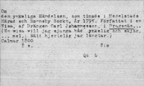 //// o» //// den ynfceligs Händelsen, som tiir.ade i Médelstada Härad och Ronneby Sockn, År 1791?» Författat i en Wisa, af Drängen Carl Johannesson, i Pra.Tanäs. ., ($n wisa will jag sjunra båd ynk e 1 i«?" oclT" STScJa r, ... ifjel»; Rätt hjertellg jag- länfftar.) CaInar 1800 //// 2 s. . B:o //// q,c b ////