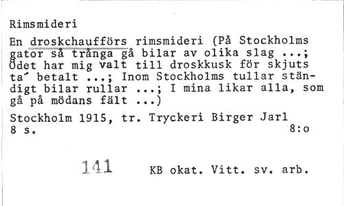//// Rimsmideri //// En droskchaufförs rimsmideri (På Stockholms gator så trånga gå bilar av olika slag ...; Odet har mig valt till droskkusk för skjuts ta"* betalt ...; Inom Stockholms tullar ständigt bilar rullar .I mina likar alla, som gå på mödans fält ...) //// Stockholm 1915, tr. Tryckeri Birger Jarl 8 s. 8:0 //// 141 KB okat. Vitt. sv. arb. ////