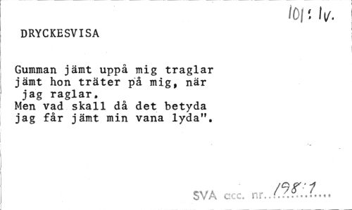 //// lör. w, //// DRYCKESVISA //// Gumman jämt uppå mig traglar jämt hon träter på mig, när //// jag raglar. Men vad skall då det betyda jag får jämt min vana lyda". //// SVA ccc. nr...^? ////