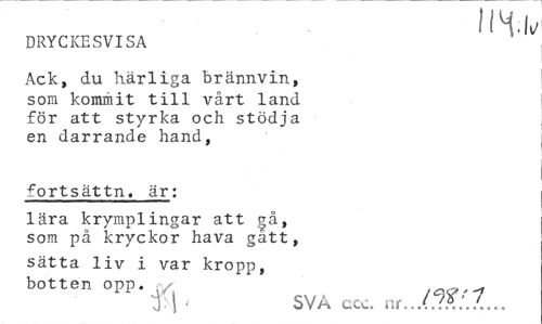 //// UH. h //// DRYCKESVISA //// Ack, du kärliga brännvin, som kommit till vårt land för att styrka och stödja en darrande hand, //// fortsättn. är: //// lära krymplingar att gå, som på kryckor hava gatt, //// sätta liv i var kropp, botten opp. / //// ] | ' SVA ecc. nr...(.7Ä ////