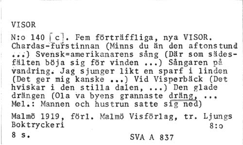 //// VISOR //// N:o 140 fel. Fem förträffliga, nya VISOR. Chardas-furstinnan (Minns du än den aftonstund ...) Svensk=amerikanarens sång (Där som sädesfälten böja sig för vinden ...) Sångaren på vandring. Jag sjunger likt en sparf i linden (Det ger mig kanske ...) Vid Visperbäck (Det hviskar i den stilla dalen, ...) Den glade drängen (Ola va byens grannaste dräng, ... Mel.: Mannen och hustrun satte sig ned) //// Malmö 1919, förl. Malmö Vis förlag, tr. Ljungs Boktryckeri 8:0 //// 8 s* SVA A 837 ////