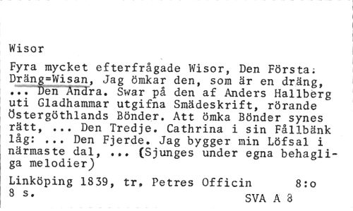 //// Wisor //// Fyra mycket efterfrågade Wisor, Den Första; Dräng=Wisan, Jag ömkar den, som är en dräng, ... Den Andra. Swar på den af Anders Hallberg uti Gladhammar utgifna Smädeskrift, rörande Östergöthlands Bönder. Att ömka Bönder synes rätt, ... Den Tredje. Cathrina i sin Fållbänk låg: ... Den Fjerde. Jag bygger min Löfsal i närmaste dal, ... (Sjunges under egna behagliga melodier} //// Linköping 1839, tr, Petres Officin 8:0 //// 8 s* SVA A 8 ////