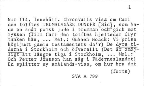 //// 1 //// N:r 114. Innehåll. Chronvalls visa om Carl den tolftes TRUMSLAGARE DUNDFR [Sicl , som hade en snål polsk jude i trumman oclr gick mot ryssen (Till Carl den tolftes hjeltedar flyr tanken hän, ... Mel,: Gubben Noack: Vi prisa högljudt gamla testamentets da'r) De dyra tiderna i Stockholm och öfverallt (Det är omöjligt att längre tiga i Stockholm, ... Mel.: Och Petter Jönsson han såg i Fäderneslandet) En splitter ny smålands-visa, om hur bra det //// (forts) //// SVA A 799 ////