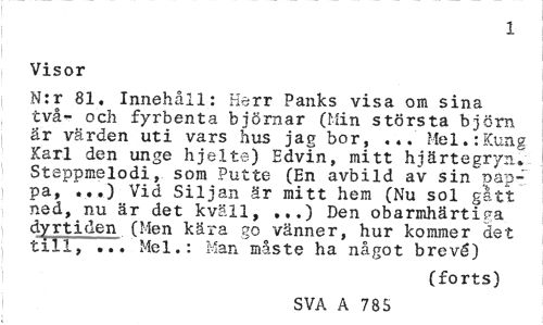 //// 1 //// Visor //// N:r 81. Innehåll: Herr Panks visa om sina två- och fyrbenta björnar (Min största björn är värden uti vars hus jag bor, ... Mel.:Kung Karl den unge hjelte) Edvin, mitt hjärtegryn. Steppmelodi, som Putte (En avbild av sin pappa, ...) Vid Siljan är mitt hem (Nu sol gått ned, nu är det kväll, ...) Den obarmhärtiga dyrtiden (Men kära go vänner, hur kommer det till, ... Mel.: Man måste ha något brevé) //// (forts) //// SVA A 785 ////