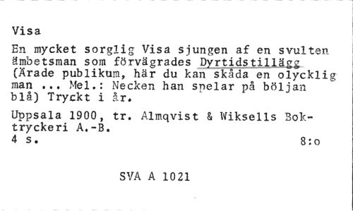 //// Visa //// En mycket sorglig Visa sjungen af en svulten-ämbetsman som förvägrades Dvrtidstillägg (Ärade publikura, här du kan skåda en olycklig man ... Mel.: Necken han snelar på böljan blå) Tryckt i år. //// Uppsala 1900, tr. Almqvist & Wiksells Boktryckeri A,-B. //// 4 s. 8:0 //// SVA A 1021 ////