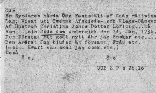//// öde ' //// Kn Syndares hårda öde Faatstält af Guds rättvis! Lagi V/iaat uti Twenné Åfskieds- eeh Kla*e-Sån?t«". Af Hustrun Christina Johns Dotter Lofl iris?.. Då Hon ... sin Döds d cm undergick ^n 14. Jan. 1736 D e n Första i ""Rt 't" "god t nytt åhr i af önskar etc., . Den Arérai Jag biud.er an försann, Fråri etc. (mel.; Horart hän skal jag dock etc,) tlooa //// 8 s. ' ' 0 . //// UUE Z P s 26;16 ////
