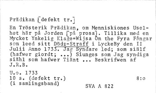 //// Prädikan { defekt tr.] //// En Trösterik Prädikan, om Henniskiones Usel-het här på Jorden ["på prosa"]. Tillika med en Mycket Ynkelig Klage=Wijsa 6m the Fyra Fångar som leed sitt Dödz-Straff i LyckeBy den II Julii Anno 1733. Jag Syndare led; som siälf (hafwer giordt; ...) Siunges som Jag syndiga siähl som hafwer Tiänt ... Beskrifwen af J.R.B. //// U.o. 1733 //// 10 s. (defekt tr.) 8:o //// (i samlingsband) SVA A m ////