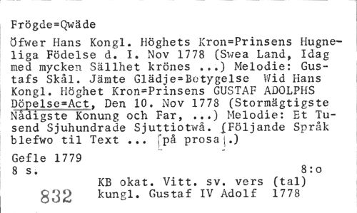 //// Frögde=Qwäde //// öfwer Hans Kongl. Höghets ICron=Prinsens Hugne-liga Födelse d. I. Nov 1778 (Svea Land, Idag med mycken Sällhet krönes ...) Melodie: Gustafs Skål. Jämte Glädie=Betygelse Wid Hans Kongl. Höghet Kronprinsens GUSTAF ADOLPHS Döpelse=Act, Den 10. Nov 1773 (Stormägtigste Nådigste Konung och Far, ...) Melodie: Et Tu-send Sjuhundrade Sjuttiotwå. X Följ ande Språk blefwo til Text ... [på prosa j.) //// Gefle 1779 //// 8 s. 8 : o //// KB okat. Vitt. sv. vers (tal) g32 kungl. Gustaf IV Adolf 1778 ////