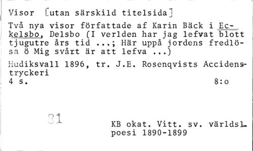 //// Visor Lutan särskild titelsida] //// Två nya visor författade af Karin Bäck i Ep-kelsbo. Delsbo Cl verlden har jag lefvat blott tjugutre års tid . Här uppå jordens fredlösa ö Mig svårt är att lefva ...) //// Hudiksvall 1896, tr. J.E. Rosenqvists Accidens-tryckeri //// 4 s. 8:0 //// 01 //// KB okat. Vitt. sv. världs3-poesi 1890-1899 ////