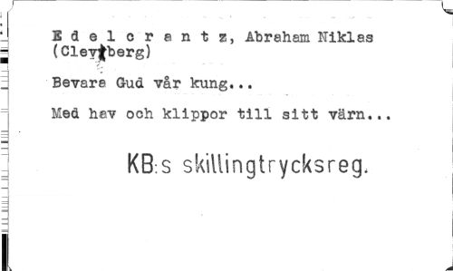 //// Sdelcrentz, Abraham Niklas = (Clevjberg) //// : Bevars Gud vår kung... //// Med hev ooh klippor till sitt värn... //// ; KB:S skillingirycksreg, //// i ////