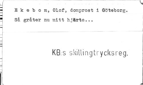 //// j E k e b o m, Olof, domprost i Göteborg. ! Så gråter nu mitt hjärta... //// KB:s skillingtrycksreg. ////