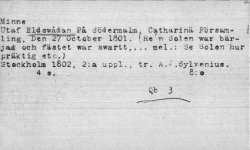 //// Minne //// Utaf Eld_swAdan Få Sed ermaiua, Catharina Församling, "^eln^njctobcr 1801. (fte'n öolen iwar härjad och fästet war swartt,... mel.: 3e Solen hur präktig etc.} //// Stockholm 1802, 2:a,uppl., tr. A. ' . Sylvenius. 4 s. 8:o //// ftb 3 ////