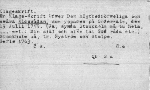 //// Ilage skrift. //// 2n Klage-Sicrif t Ofwer Den högtbedröfweliga och swåra Eld swådan som yppades på Södermalm, den L9 Jul i i 17 r9. T Ja, synda Stoakhel» ¦ mk tu heta, ... mel.. Min siäl och sine lät Gu<Ä råda etc.) StocKholm uå, tr. Nyström och Stolpe. //// >ef le I7t?3 . //// 8 s. 8; o //// ^b 2 a ////
