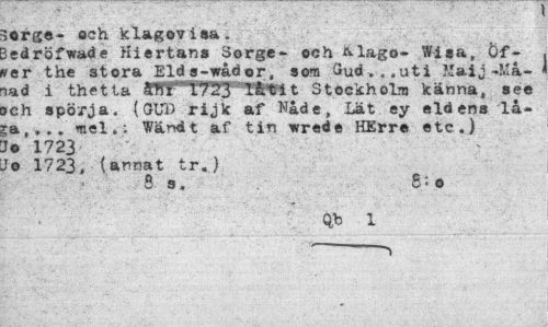 //// »orge- och klagoviaa. //// Sedröfwade Hiertans Sorge- och &lago« Wisa, Öf-fer the stora Elds-wådor, som Gud .. .uti Maij-Må- < iad i thetta SWT8låtit Stockholm känna, aee >ch spörja. (GUD rijk af Nåde, Lät ey eldens lå-ja,... mel.: Wändt af tin wrede HErre etc.) J© 1723 //// Jo 1723, (annat tr.) //// S 3. 5=0 //// Q.b 1 ////