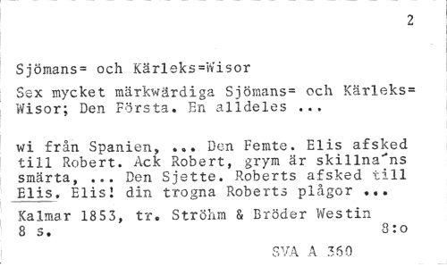 //// 2 //// Sjömans= och Kärleks=Wisor //// Sex mycket märkwärdiga Sjömans= och Kärleks® Wisor; Den Första. En alldeles ... //// wi från Spanien, ... Den Femte. Elis afsked till Robert. Ack Robert, grym är skillna^ns smärta, ... Den Sjette. Roberts afsked till Elis, Elis! din trogna Roberts plågor ... //// Kalmar 1853, tr. Ströhm & Bröder Westin 8 s. 8: o //// SVA A 360 ////