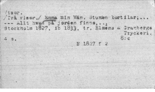 //// fisor. //// ,'ivk visor./ Jtenn» min tån. oturtien oort i lar i... //// ---Allt hwarfpST jordsn firn»,. //// Stockholm 18^7, ib 1833, tr. Älatena <&. Sranberg* //// Tryckeri. //// 43. 8;c //// E 1827 f "£ ////