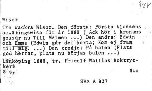//// ny //// Wisor //// Tre wackra Wisor. Den första: Första klassens , bewäringswisa för år 1880 ( Ack hör i kronans gossar nu Till Malmen ...) Den andra: Edwin och Emma (Edwin går der borta; Kom ej fraw till mig. ...) Den tredje: På balen (Plats god herrar, plats nu börjas balen ...) //// Linköping 1880, tr. Fridolf Wallins Boktrycket! //// 8 $-• 8:o //// SVA A 949 ////