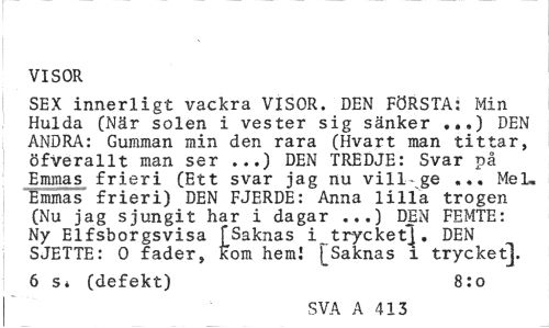 //// VISOR //// SEX innerligt vackra VISOR. DEN FÖRSTA: Min Hulda (När solen i vester sig sänker ,..) DEN ANDRA: Gumman min den rara (Hvart man tittar, öfverallt man ser ...) DEN TREDJE: Svar på Emmas frieri (Ett svar jag nu vill-ge ... Mel, Emmas frieri) DEN FJERDE: Anna lilla trogen (Nu jag sjungit har i dagar ...) DEN FEMTE: Ny Elfsborgsvisa [Saknas i trycket!. DEN SJETTE: 0 fader, kom hem! [Saknas i trycket], //// 6 Si (defekt) 8:0 //// SVA A 413 ////