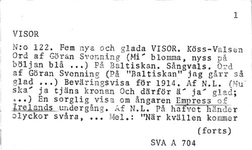 //// 1 //// VISOR //// N:o 122. Fem nya och glada VISOR. Köss-Valsen Ord af Göran Svenning (Mi" blomma, nyss på böljan blå ...) På Baltiskan. Sångvals. Ord af Göran Svenning CPå "Baltiskan1' jag gårr så glad ...) Beväringsvisa för 1314. Af N.L. (Nu ska'' ja tjäna kronan Och därför ä" ja' glad; ,..) En sorglig visa om ångaren Empress of Irelands undergång. Af N.L. På hafvet händer olyckor svåra, ... Mel.: "När kvällen kommer //// (forts) //// SVA A 6 76 ////