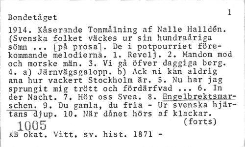 //// Bondetåget 1 //// 1914. Kåserande Tonmålning af Nalle Halidén. (Svenska folket väckes ur sin hundraåriga sömn ... j_på prosa"]. De i potpourriet förekommande melodierna. 1. Revelj. 2. Mandom mod och morske män. 3. Vi gå öfver daggiga berg. 4. a) Järnvägsgalopp, b) Ack ni kan aldrig ana hur vackert Stockholm är. 5. Nu har jag sprungit mig trött och fördärfvad ... 6. In der Nacht. 7. Hör oss Svea. 8. Engelbrektsmar-schen. 9. Du gamla, du fria - Ur svenska hjärtans djup. 10. När dånet hörs af klackar. //// 1005 (forts) //// KB okat. Vitt. sv. hist. 1871 - ////