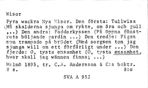 //// Wisor //// Fyra wackra Nya Wisor. Den första: Tullwisa ;vMå skalderna sjunga om rykte, om ära och gull ,..) Den andra: Fadderkyssen (På öppna fönstrets böljande gardin ...) Den tredje: Pigan som trampade på brödet (Med sorgsen ton jag sjunga will oin ett förfärligt under ...) Den fjerde: O, tysta ensamhet (O, tysta ensamhet., hwar skall jag wännen finna; ...) //// Mslmö 1895, tr. C.A. Andersson & C:s boktr. 8 s. 8:0 //// SVA A 952 3 ////