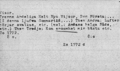 //// fisor. //// "renne Andeliga Helt Nya Wijaor, Den Förata;.,. . I denna ljufwa Sommartid, . . .) Then Andra: Luften börjar swalicae, etc. (mel,: Andana helga Nåde, Then Tredje; Kom ensamhet min bästa etc. Jo 1772. » //// 8 s. 8:0 //// Zss 1772 d ////