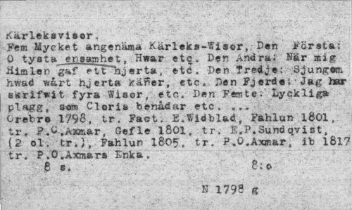//// Kärleksvisor. //// Fem Mycket angenäma Kär leks-Wisor,; Dan Första; 0 tysta ensamhet. Hwar etc. Den Andra; När mig Himlen gaf ett^hjerta, eté. Den Tredje: Sjungam hwad wårt hjerta käner, etc. Den Fjärde; -Jag har skrifvit fyra Wisor, etc. Den Femte; Lyckliga plagg, som C loris benådar etc. ... Crebra 1798, tr. Fact. E.Widblad, Fahlun 1801, tr. P.O.Axmar, Gefle 1801, tr. K.P.Sund qvi ct, (2 ol. tr.), Fahlun 1805, tr. P.ö.Axmar, ib 1817 tr. P.O.Axmara Enka . //// 8 s. 8:0 //// ¦ K 1798 g ////