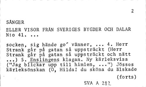 //// 2 //// SÅNGER //// ELLER VISOR FRÅN SVERIGES BYGDER OCH DALAR N:o 41. ... //// socken, sig hände go" vänner, ... 4. Herr Strank går på gatan så uppsträckt (Herr Strank går på gatan så uppsträckt och nätt ...) 5. Enslingens klagan. Ny kärleksvisa ("Jag blickar upp till himlen, ...") Jösses kärleksönskan (0, Hilda! du sköna du älskade //// (forts) //// SVA A 281 ////