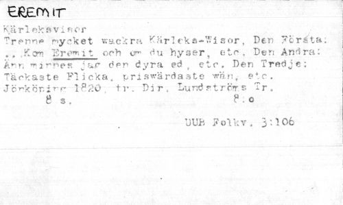 //// E(5£fr> tr //// Kärlek»vi ner //// Trenn*» pycket wackra Kärlckft-»i»or, Den Fc-rsta. ., ,Kcm Eri-^i* och du hyaer, et c. Den And ra: Arr, "irnpe jden dyra ed, etc. Den Tredje; Tärkaste Flicka, prisvärdaste etc. //// Jc^kor-ir-r 1820 tr. Dir, LundrtrÖTS Tr, 8 s. P.o //// UUB Folk v, 3:106 ////