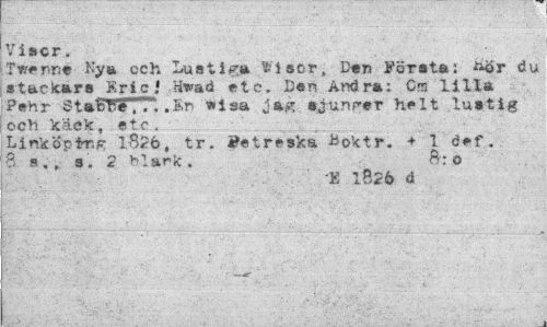 //// Viscr. //// Twenne Rya och Lustiga Viscr,-Den Först»: ^ör du stackars Kric.1 Hw*d etc. Den Andra: Cm lilla Pehr St»bFéIT". ,Sn wisa sjunger helt lustig och käek, etc . //// Linkopftig 1626, tr. ««treska B0ktr. + 1 def. 8 a., s. 2 blark. //// •E 1826 d ////