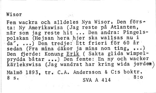 //// Wisor //// Fem wackra och alldeles Nya Wisor* Den första: Ny Amerikawisa (Jag reste på Atlanten, när som jag reste hit ... Den andra: Pingels-polskan (Hejsan hera hjer ska wallsas nu i da", ...) Den tredje: Ett frieri för 60 år sedan (Fra mina däkor ja mins non ting, Den fjerde: Konung Erik ( Sakta glida wimpel-prydda båtar ...) Den femte: En ny och wacker kärlekswisa (Jag wandrat har kring wida jorden^ //// Malmö 1893, tr. C.A. Andersson & C:s boktr, //// 8 s* SVA A 414 8:0 ////