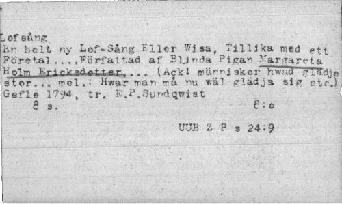 //// lofsång //// Kr helt ny Lof-Sång Filer Tillika med ett //// Företal ..Författad af Blinda ?iicran Färgaret a Holrr. ..ExJ^ka&B^tAE- ... 1 Ack 1 w i skor nw;,d riädj« st or... mel,Hvar man ^å ru *äl glädja »itr etc.) Gefle tr. E.P.Sundqwist //// 8 3. 6 ; c //// UUB 2. ? g 24 i 9 ////
