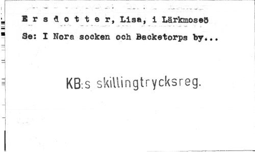 //// . Ersflotter, Lisa, i Lärkmoseö ¦ Se: I Nora socken och Backetorps by... //// = KB:S skiilingtrycksreg. ////