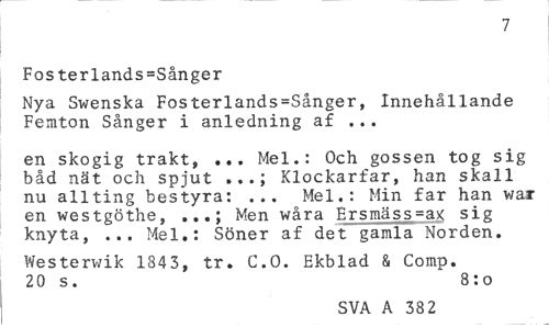 //// 7 //// Fos terlands=Sånger //// Nya Swenska Fosterlands=Sånger, Innehållande Femton Sånger i anledning af ... //// en skogig trakt, ... Mel.: Och gossen tog sig båd nät och spjut ...; Klockarfar, han skall nu allting bestyra: ... Mel.: Min far han v/ar en westgöthe, ...; Men wåra Ersmäss=ax sig knyta, ... Mel.: Söner af det gamla Norden. //// Westerwik 184 3, tr. C.O. Ekblad & Comp. 20 s. 8:o //// SVA A 38 2 ////