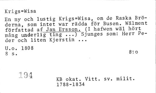 //// Krigs=Wisor //// En ny och lustig Krigs=Wisa, om de Raska Bröderna, som intet war rädda för Busen. Wälment författad af Jan Ersson. (I hafwen wäl hört mång underlig ting ...) Sjunges som: Herr Peder och liten Kjerstin ... //// U.o. 1808 //// 8 s. 8-0 //// 1 94 //// KB okat. Vitt. sv. milit. 1788-1834 ////