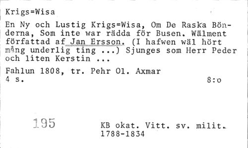 //// Krigs=Wisa //// En Ny och Lustig Krigs=Wisa, Om De Raska Bönderna, Som inte war rädda för Busen. Wälment författad a f...Jan Ersson. (I hafwen wäl hört mång underlig ting ...) Sjunges som Herr Peder och liten Kerstin ... //// Fahlun 1808, tr. Pehr 01. Axmar //// 4 s. 8:o //// 195 KB okat. Vitt. sv. milit- //// 1788-1834 ////