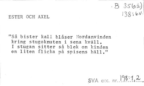 //// -B 3s($%) //// ! bv/- //// ESTER OCH AXEL Jö //// "Så bister kali blåser Nordanvinden kring stugoknuten i sena kväll. I stugan sitter så blek om kinden en liten flicka på spisens häll." //// SVA ccc. ////