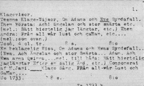 //// 1. //// 'Clagcviscr. //// Twenne Klage-^ij sor, Om Adams och Sv e Syndafall. The^i Första: Ach! ängslan o^h a tor smarta etc. (mel. i Rätt hiertelig jag längtar, etc.) Then (\rdra: Från all wår lust och garffan, etc... (mel.; som ovan.) //// Uooå, 4 ol. tr. p 3, P: o //// Sn beklägelig Wisa, Cm Adams Rwas Syndefall., (Iwa. Ach Ängslan och stor Smärta... Ad ar . Ach F;wa arma , .. ,me 1. t. il T "båda: Hätt hierteli* //// jaglä"'tar S^ter e^ salig And, etc.) Componerat //// ".Jani,_JClago FRån al!-wår Lust och //// Sargar,... //// Jo 1733 - v e s.. ' 8:o //// r-j . f» \ ////