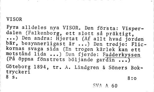 //// VISOR //// Fyra alldeles nya VISOR. Den första: Visper-dalen (Falkenborg, ett slott så präktigt, .,.) Den andra: Hjertat (Af allt hvad jorden bär, besynnerligast är ...) Den tredje: Flickornas svaga sida (En trogen kärlek kan ett motstånd lida .,.) Den fjerde: Fadderkyssen (På öppna fönstrets böljande gardin ...) //// Göteborg 1894, tr. A. Lindgren & Söners Boktryckeri //// 8 s. 8:0 //// SVA A 60 ////