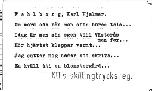 //// ! a h 1 b o r g, Karl Hjalmar. //// i //// Om mord odh rån man ofta höres tala... //// d Idag är man aln egen till Västerås //// man far... HSr hjärtat klappar varmt... //// «Tag sätter mig nefler 8tt skriva... //// En kväll iiti en blomstergård... //// ¦ KB s skillingtrycksreg. ////